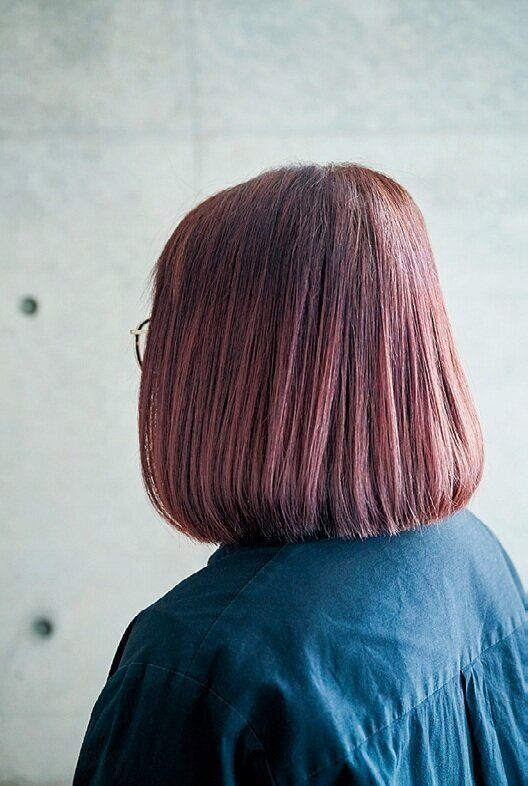黒い服が好きでアクセサリーもつけないので、赤系のヘアカラーで華やかさをさりげなくプラス。「黒髪だと白髪が目立っちゃうけど、明るい色みならなじんでくれるのもいいんです(笑)」。