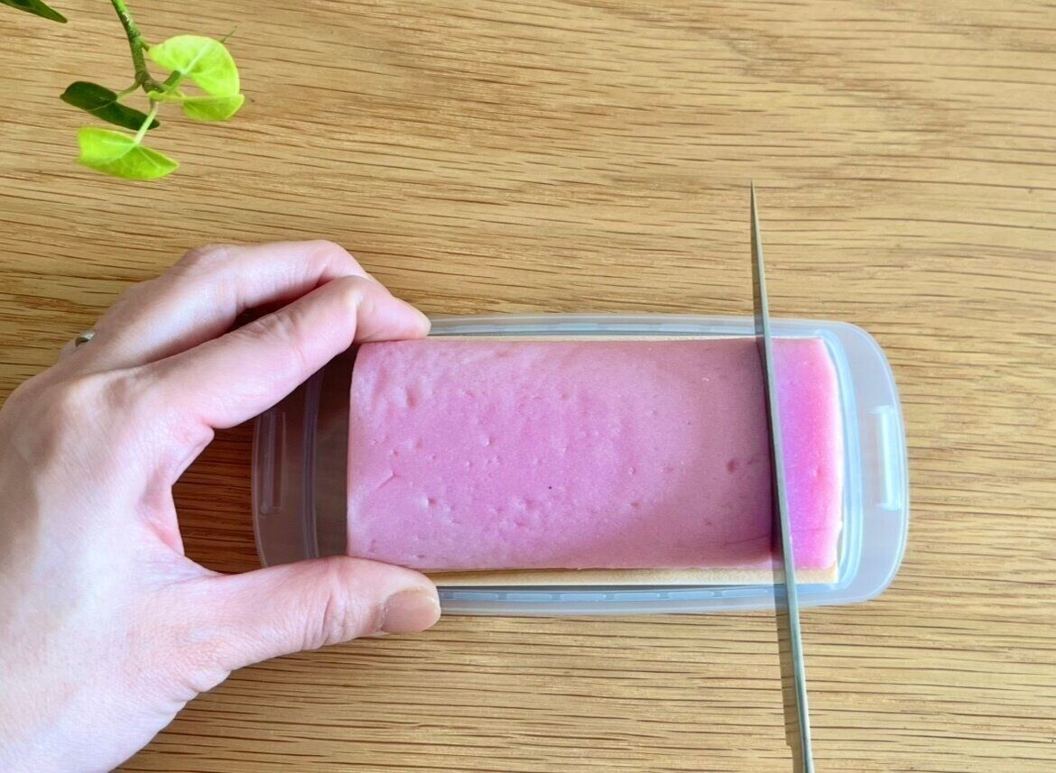 保存容器の底の部分をよく見ると目盛りがついているので、その溝に合わせて包丁で切るだけでOK!迷わず均一にかまぼこを約12mmというおいしい厚みで切ることができますよ。