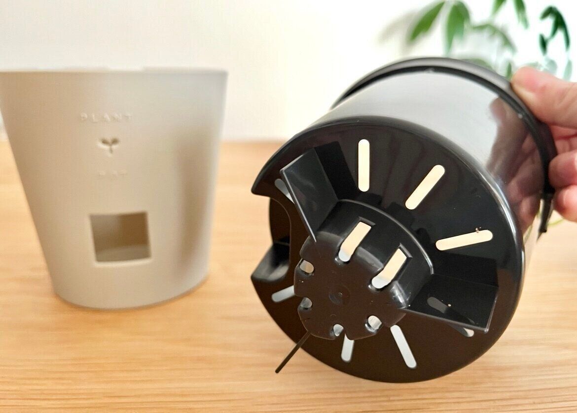 そして外側の鉢の底には適度に水を貯められるスペースがあり、内側の鉢の底には穴と段差があります。つまり外側の鉢に貯まった水を、内側の鉢の穴から適量吸い上げることにより、自動で植物に水を安定的に与えられるようになるようです。