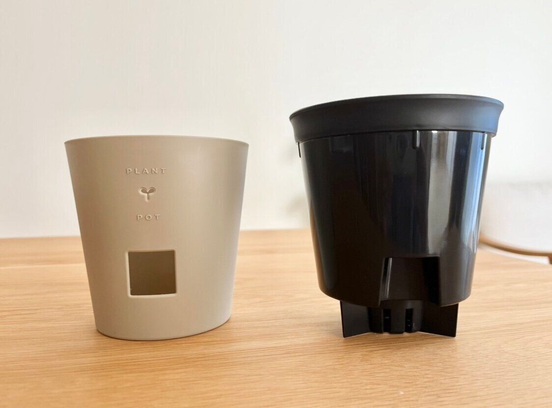 底面給水機能のある植木鉢の特徴としては、二重構造になっているということです。こちらの商品も外側のグレーの鉢と内側の黒い鉢の二重構造になっています。
