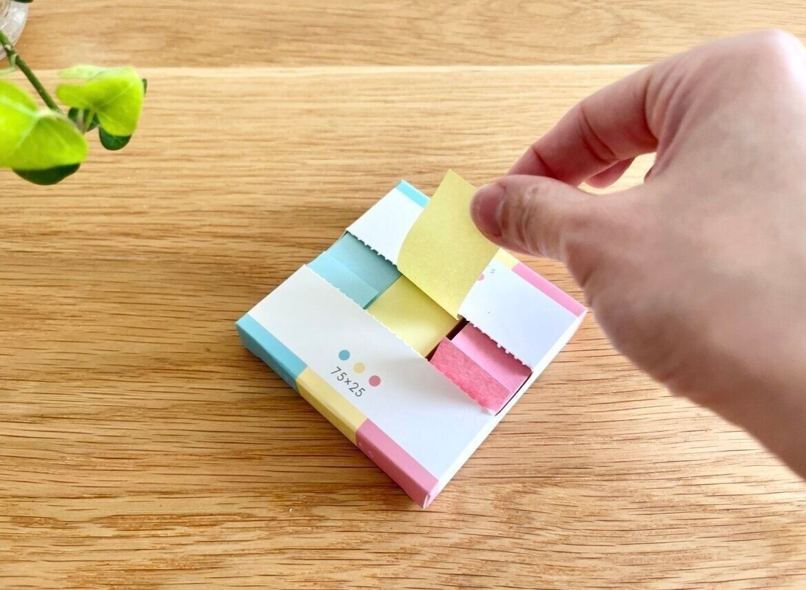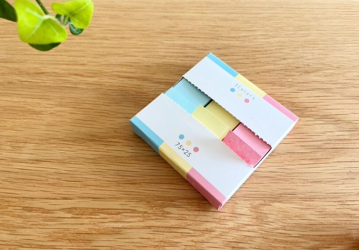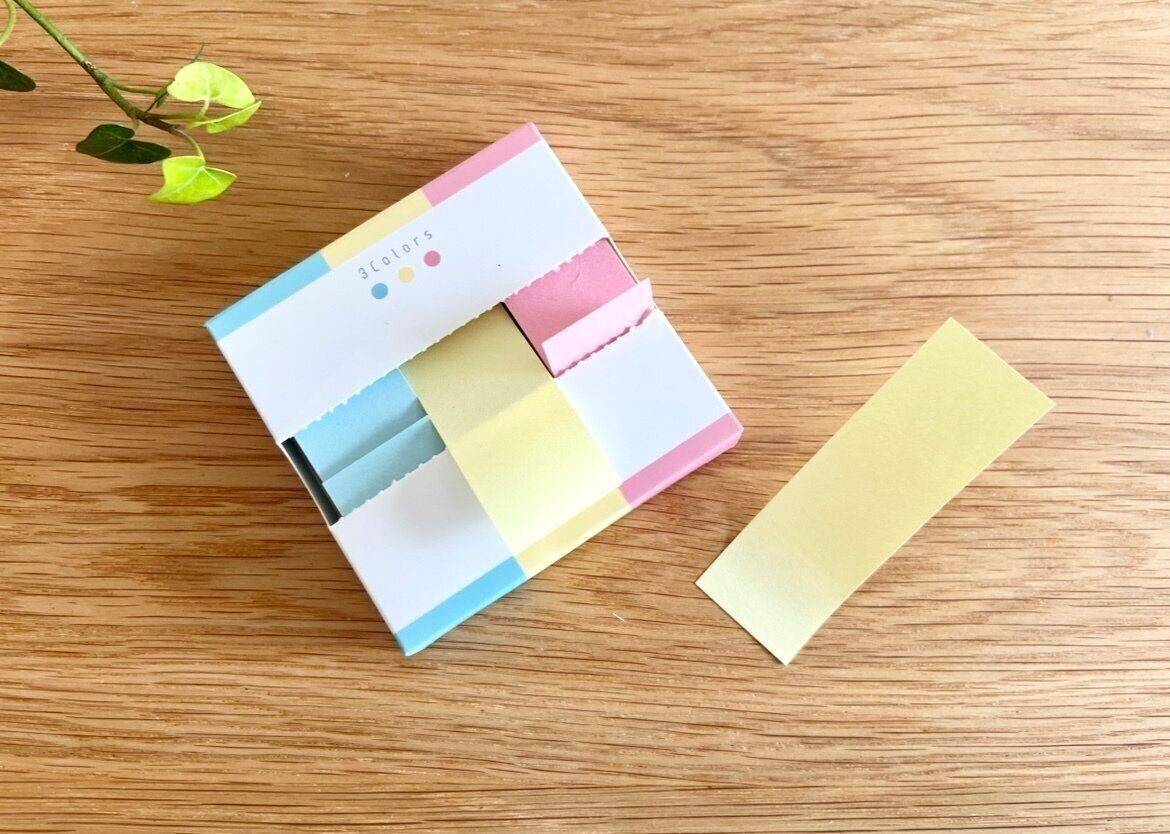 1枚の付箋のサイズは、約75mm✕25mm。小さ過ぎず大き過ぎず使いやすいサイズです。3色もあるので、色分けして使うこともできますよ。