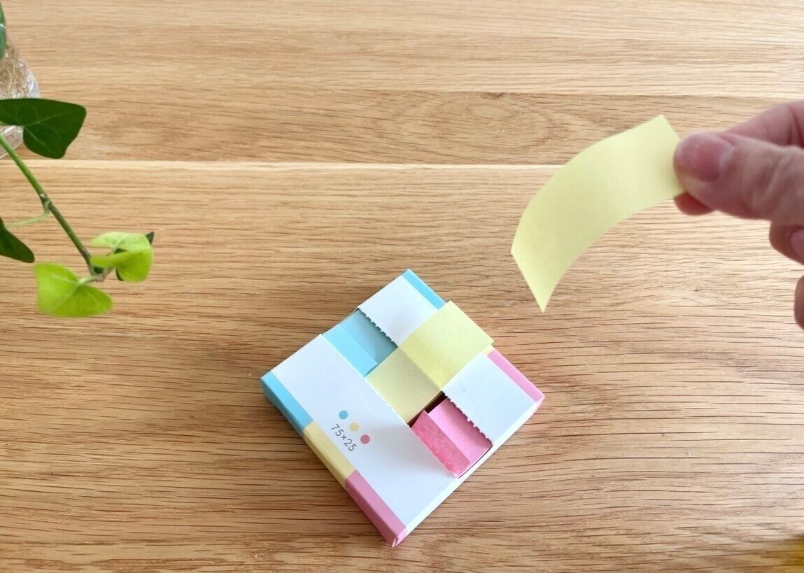 片手で付箋を摘んで、上に持ち上げるように引っ張ればサッと取れるんです!1枚ずつ付箋をめくるのって意外とプチストレスに感じてしまうこともあります。それに勉強や仕事中など、ペンを持っていて片手が塞がっていることって結構あるので、片手でサッと手軽に付箋を取れるのは凄く便利ですよね?