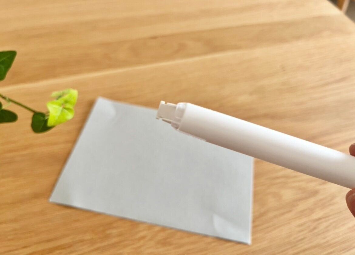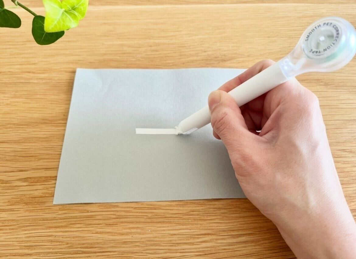 使い方もとっても簡単!先端のカバーをスライドさせてペン先を出せば、一般的な修正テープと同じように使えます。テープの幅も5mmなので一般的な修正テープの幅と一緒。使い切りタイプではありますが、長さは6mもあるので結構長く使えるかと思います。