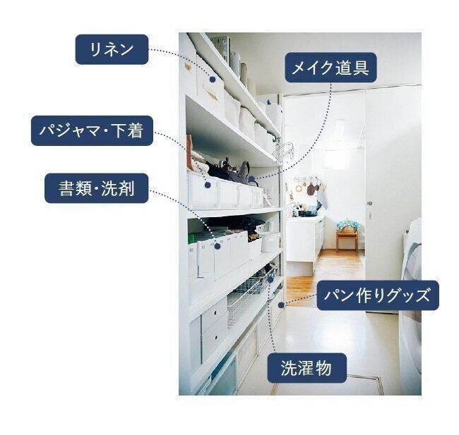 洗面所の壁面に作った大容量の収納もフルオープン。キッチンのすぐ隣なので、書類やパン作りグッズもここを定位置に。軽い物は上、重い物は下に収納して出し入れをラクに。