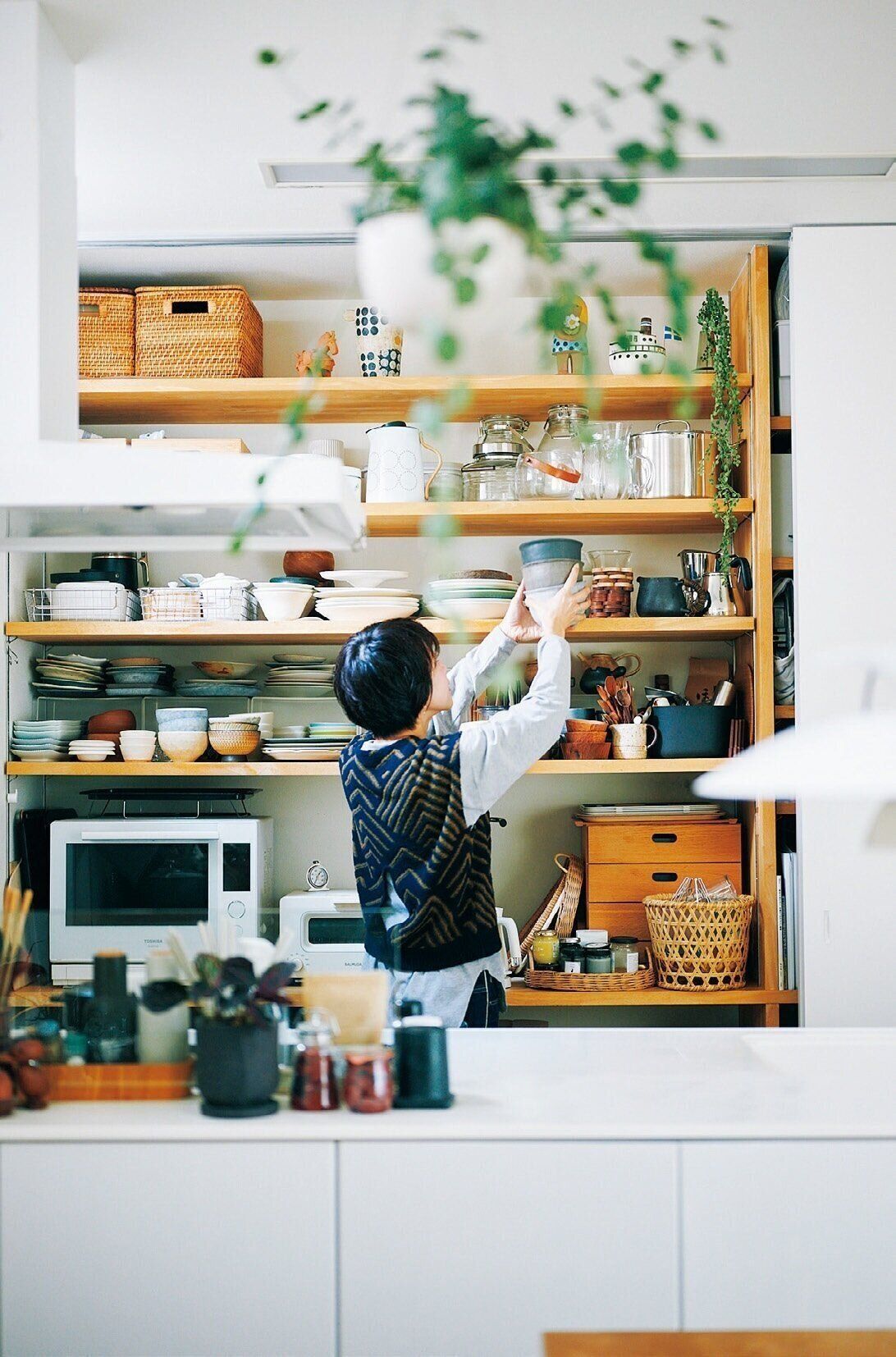 棚は扉で隠すこともできるけれど、あえて開けっ放しに。並べた食器はどれも普段使いのお気に入りばかり。「眺める楽しさと、すぐ出し入れできる便利さを両立させています」。