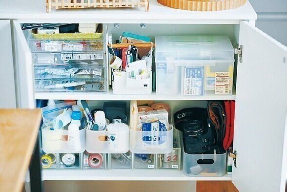 キッチンカウンターのダイニング側の扉を開けると、生活感のある物がぎっしり。薬や文房具などは、中身が見える透明ケースでざっくり分類しています。
