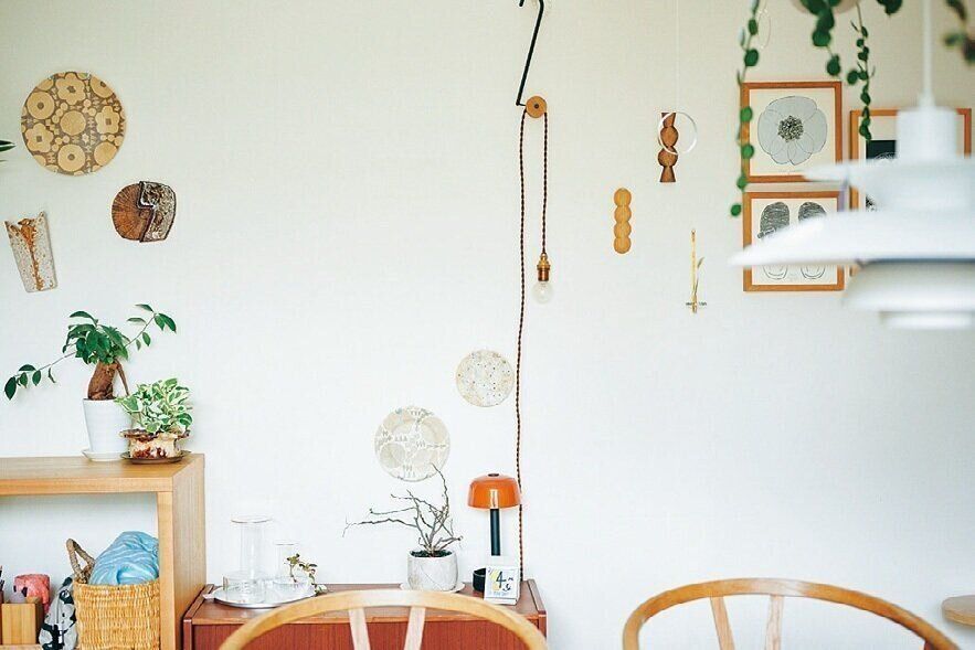 「小さい頃から家のチラシや間取りを見るのが好きで、今もおうちのことばかり考えています(笑)」。マイホーム購入時は夫婦2人で物が少なかったものの、長女の誕生で一気に物量が増加。「当時のミニマリストブームに乗って服を減らしたら、全然楽しくなくて。ただ減らすのではなく、自分にとって心地いい量が一番なんだと気づきました」。その後、子どもの成長記録を兼ねてインスタを開始。よそのお宅の映え写真に圧倒され、「こんな100点満点の状態をキープするのは無理」と意気消沈。そんなとき仕事仲間から「何点の暮らしを求めているの?」と聞かれたのが、今の“65点の暮らし”を目指すきっかけとなりました。「100点は無理だけど、50点は少し低い。頑張り過ぎずに続けられる65点くらいが、私にはちょうどいい。好きな物を愛でながら暮らすために、自分のキャパ以上の量は持たない。少な過ぎず多過ぎない、自分にとってちょうどいい物量を模索しています」。