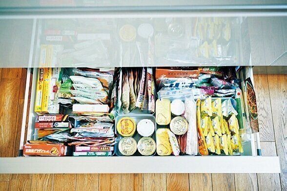 キッチンの食品ストックはスペース内をケースで仕切り、種類ごとに立てて見やすく&取り出しやすく。「賞味期限が見えるようにパッケージを入れるのがポイント」。