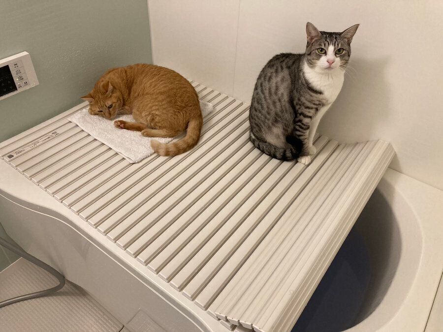 「冬が深まり寒くなってくると、こいもちゃんがお風呂に来てくれるようになりました。そのフタが開けにくくなっている状況がおもしろくてバズりました。その後の入浴時にはサバシもついてきて、完全にフタが開けられなくなってしまったのです」