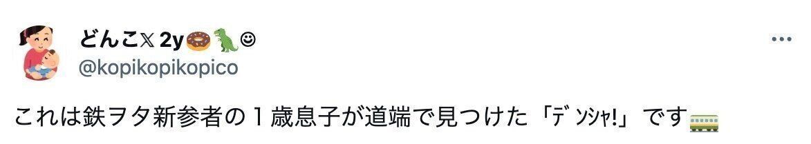 どんこX 2yさん(@kopikopikopico)が投稿したのは、当時1歳の息子くんが、道端で大好きな電車を見つけたときの写真。素晴らしい発想と感性に、Xでは2.3万件のいいねや「センスいい」といったコメントが寄せられ、話題になりました。