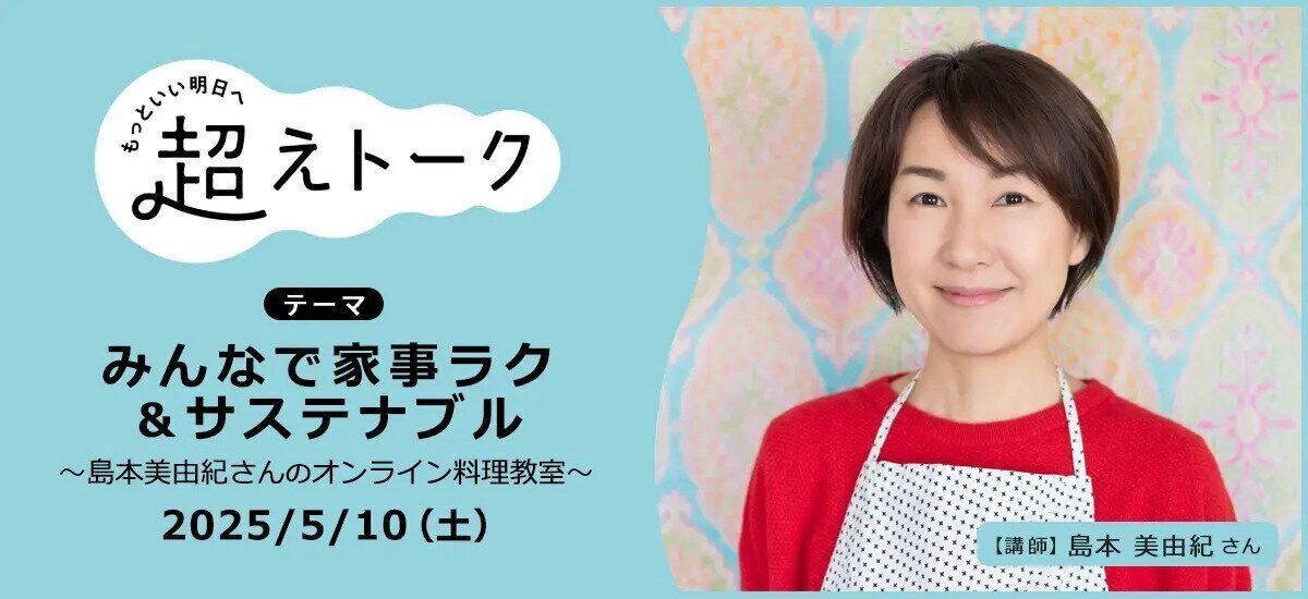 「みんなで家事ラク&サステナブル」~島本美由紀さんのオンライン料理教室~ 開催概要 【開催日時】2025年5月10日(土)10:00~12:00(予定) 【開催方法】 Zoomウェビナーよる配信 ※事前申込者に期間限定でアーカイブ動画を後日配信予定 【講師】島本 美由紀さん(料理研究家、ラク家事アドバイザー) 【定員】1,000人 【参加費】無料 【締め切り】2025年4月27日(日)まで 【イベント詳細・申込】https://forms.gle/MzBDeAT52mq3XfsUA