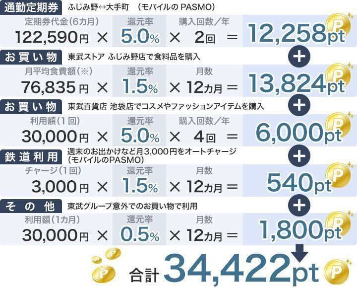 たとえば、東武東上線「ふじみ野」駅が最寄りの方を例にシミュレーションしてみましょう。池袋で乗り換えて大手町に通勤、食料品は駅前の東武ストアで購入。季節ごとに池袋の東武百貨店で買い物したり、休日には東武線でお出かけしたりすれば…