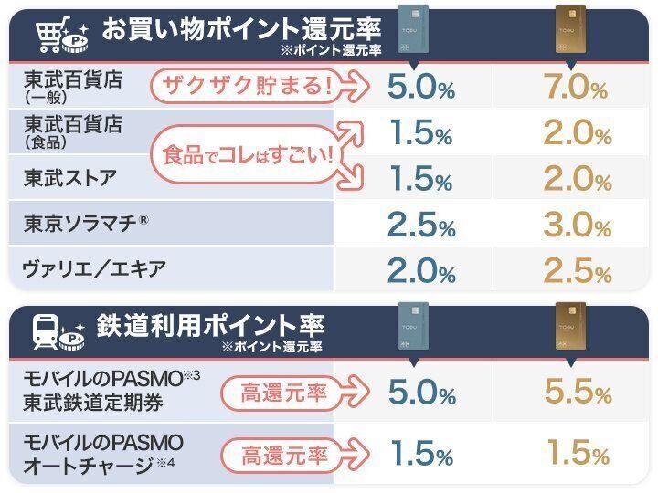 3種類あるカードのうち、VIPカードは完全招待制なので、ここでは、「東武カード(スタンダード)」と「東武カードゴールド」でポイント還元率を見ていきます。