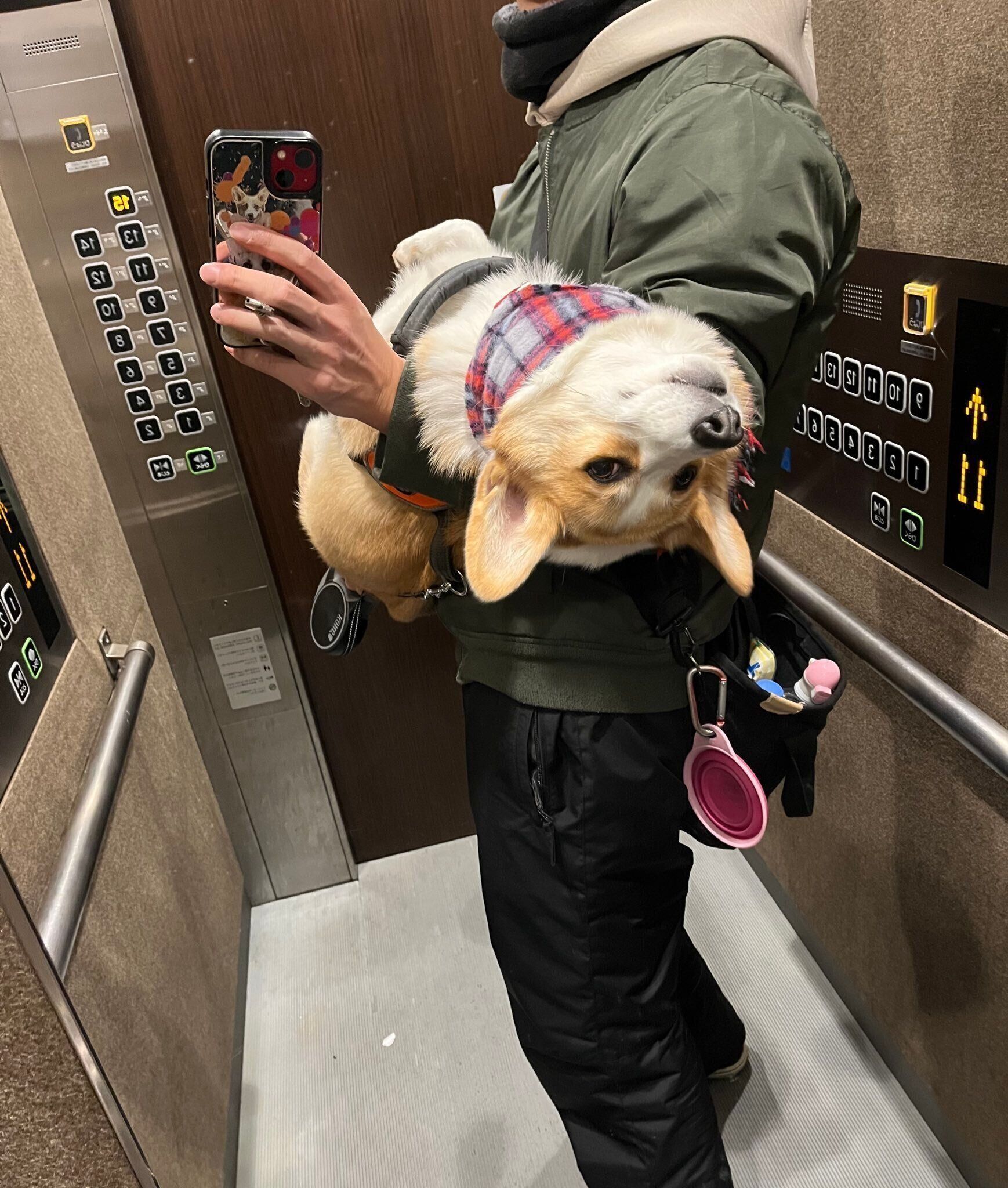 「お散歩に1時間半〜2時間行くので、疲れもあるかと思いますが、甘えてぐでんぐでんになっているのだと思います。眠たくなった閣下を運ぶときは、子犬のころからこのお姫さま抱っこをしていたので、運んでもらえると思っているようです。多くの人が子どものころ、寝落ちしたときに布団に運んでもらったことがあるかと思いますが、そのような幸福感を閣下も感じているようで、お姫さま抱っこをすると閣下は常に脱力モードになります」