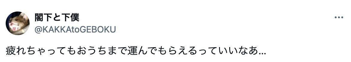 閣下と下僕さん(@KAKKAtoGEBOKU)の投稿に、多くの注目が集まっています。投稿したのは、愛犬閣下くんがお散歩中、疲れて歩けなくなってしまったときの写真。あまりの脱力感とかわいさに、11万件ものいいねが集まり、話題になりました。