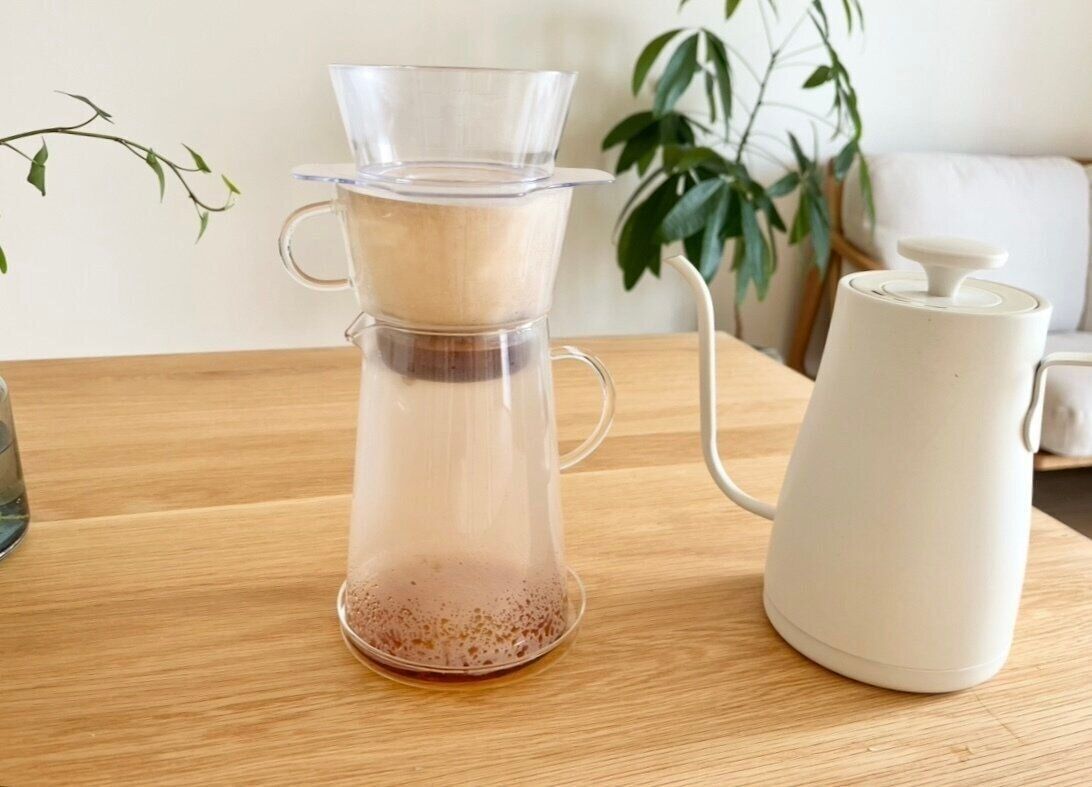 そして、お湯が全て落ちるのを待つだけでOK!ちなみに、この方法でも美味しいコーヒーが淹れられますが、もし余裕があればお湯を一気に注ぐ前に少量のお湯で蒸らすと、より美味しいコーヒーが淹れられるそうです。