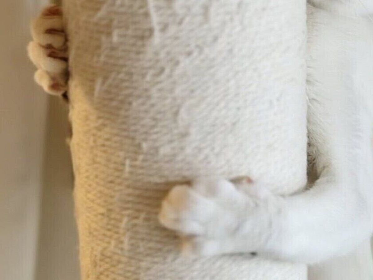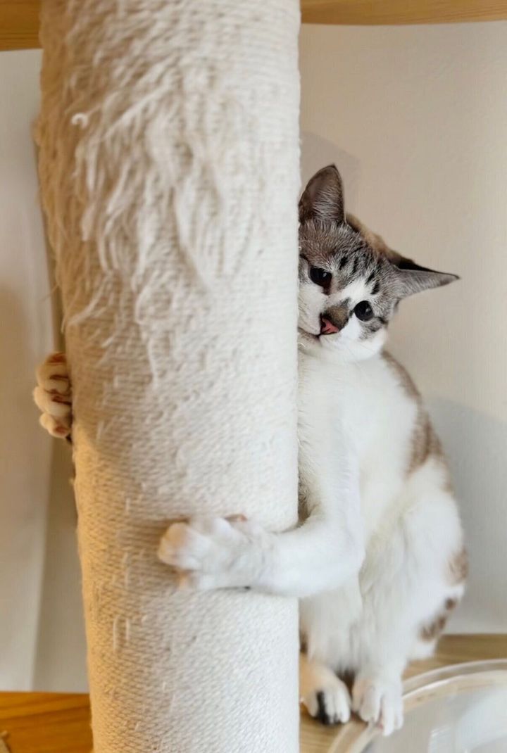 びっくりしたミントちゃんはキャットタワーの柱に両腕でしがみつき、内股に。