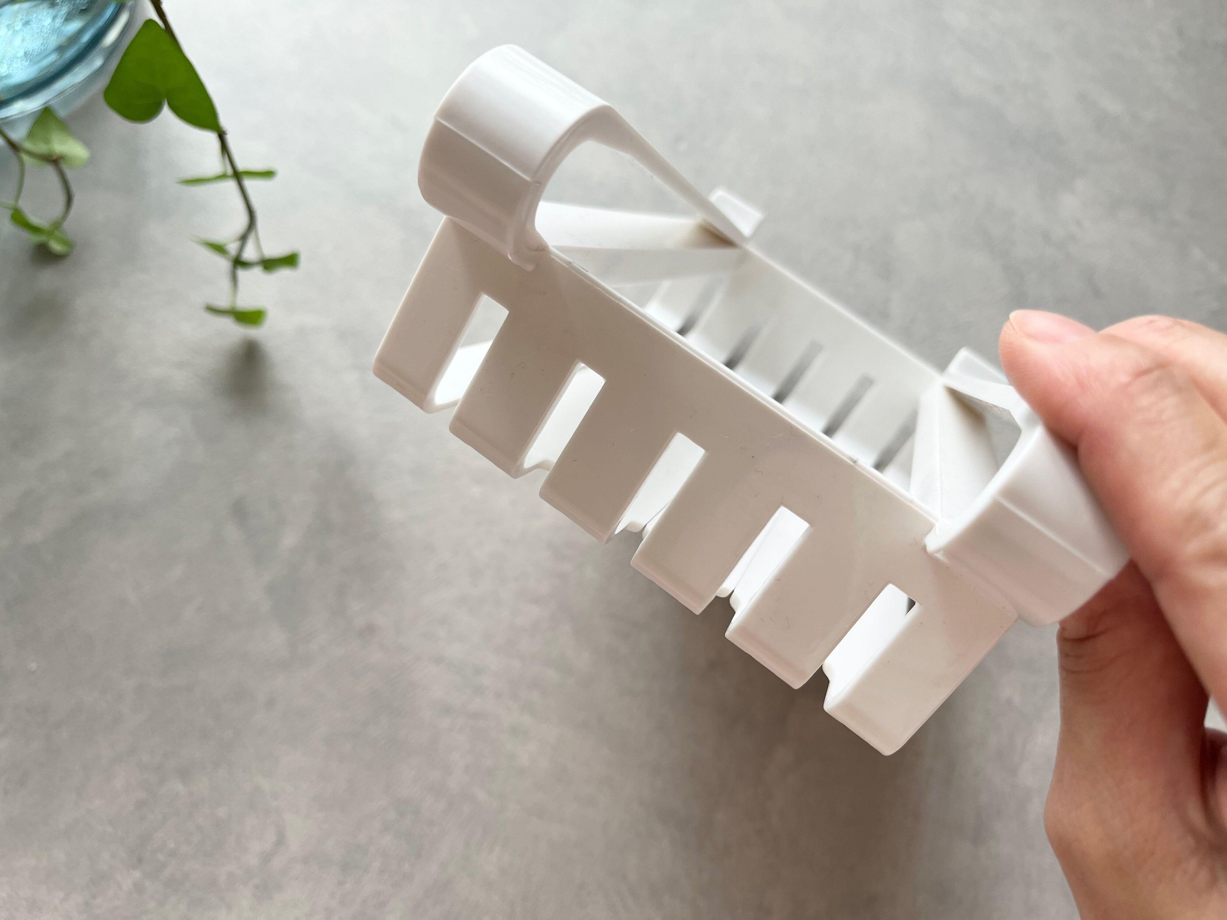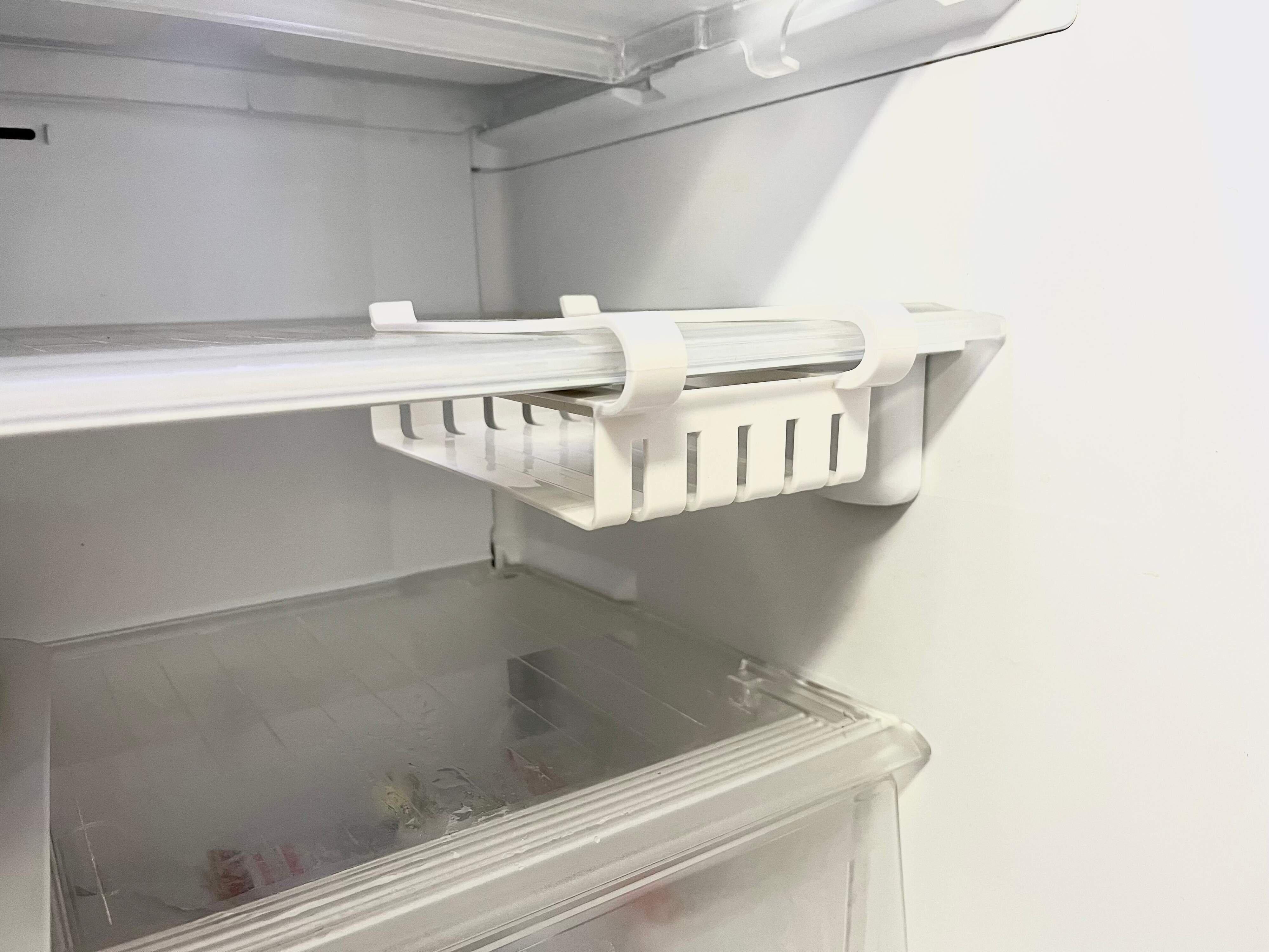 取りつけ方は簡単で、本体のフック部分を冷蔵庫の棚板にスライドさせながら引っかけるだけです。取りつけられる場所は、厚み1.5cm以下、奥行20.5cm以上、横幅11cm以上の棚板となっているので、ご使用前にご自宅の冷蔵庫の棚板をご確認くださいね。