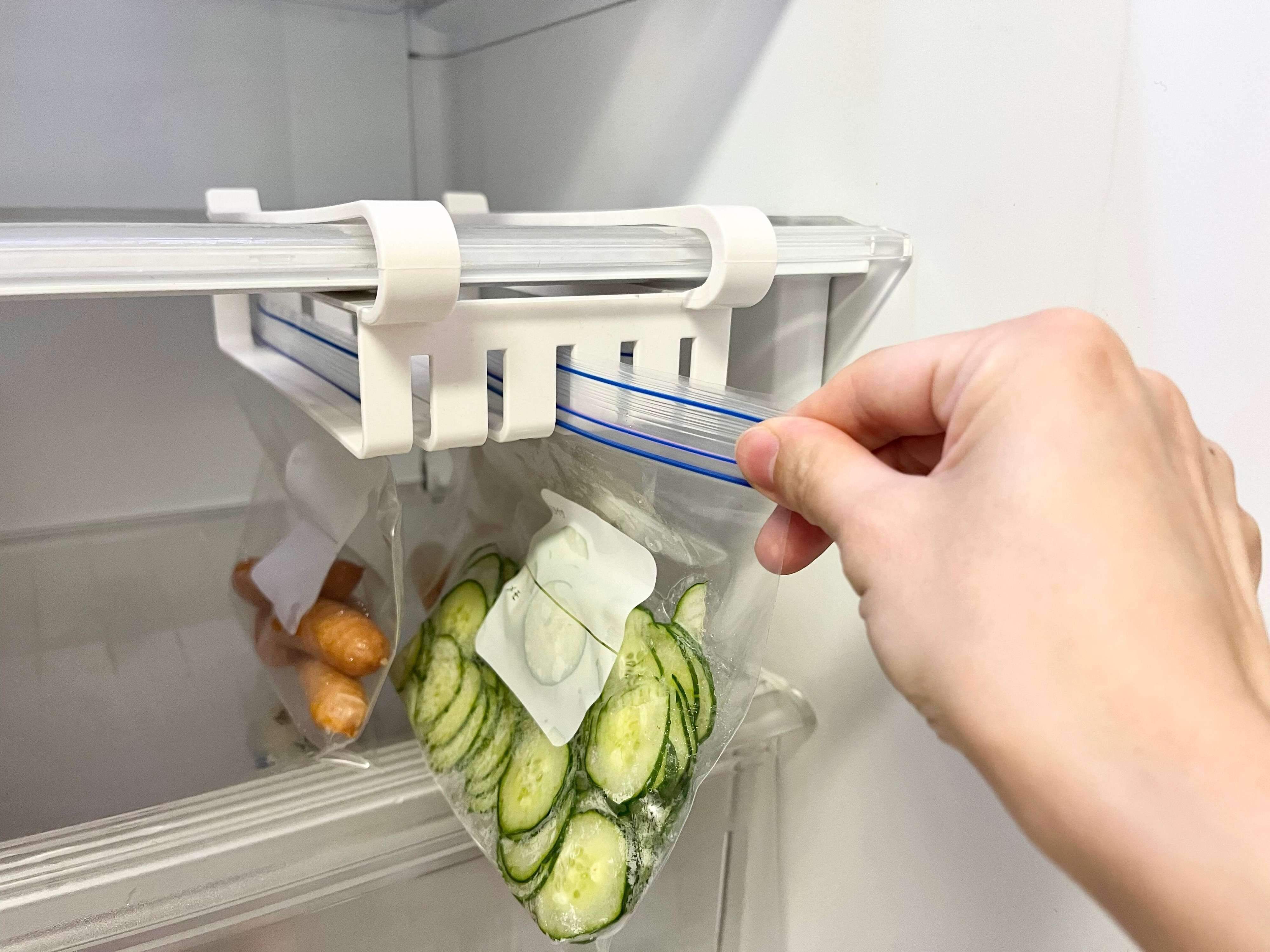 あとはジッパーバッグに入れた漬け置きしたい食材や、小分けにした食材などを吊り下げます。対応しているジッパーバッグはS~Lサイズ。最大5個まで吊り下げられ、吊り下げ可能重量は約500gまでとなっています。