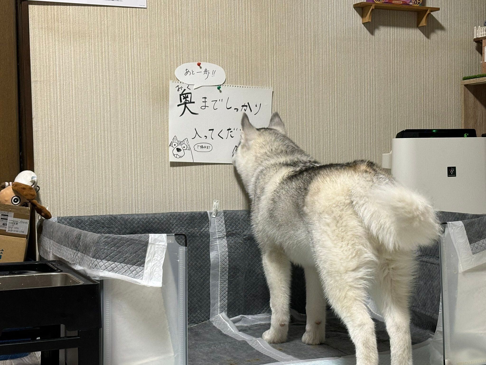 投稿当時1歳前だったシベリアンハスキーの福丸くんもトイレトレーニングをがんばっている最中でしたが、飼い主さんには”ある悩み”がありました。それは、トイレの手前で用を足してしまうこと。