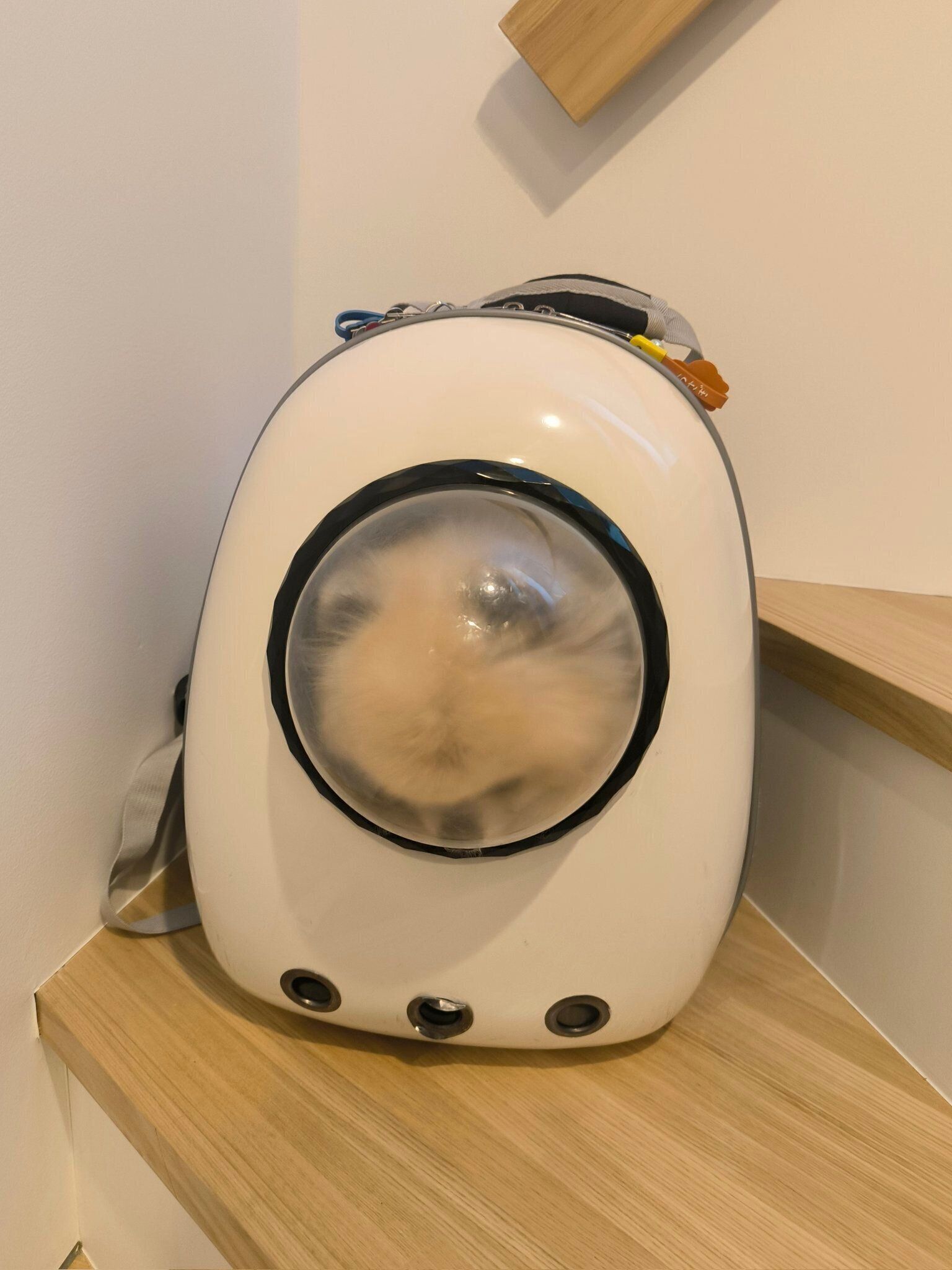 宇宙船のようなキャリーリュックの中から、楽しそうな笑顔で外を見つめています。