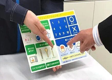 品出しの際におむすびに「エコ割(涙目)シール」を貼って食品ロス削減の取り組みを体験したり、様々な理由から会話がしづらいお客さんに対して「コミュニケーション支援ツール」を使いスムーズに買い物できるようサポートするなど、誰もがいきいきと暮らせる社会づくりの重要性について学びます。