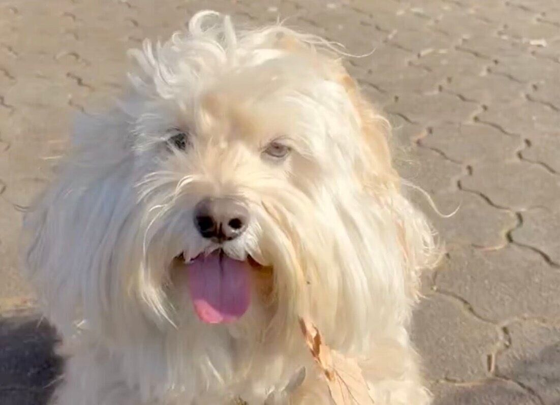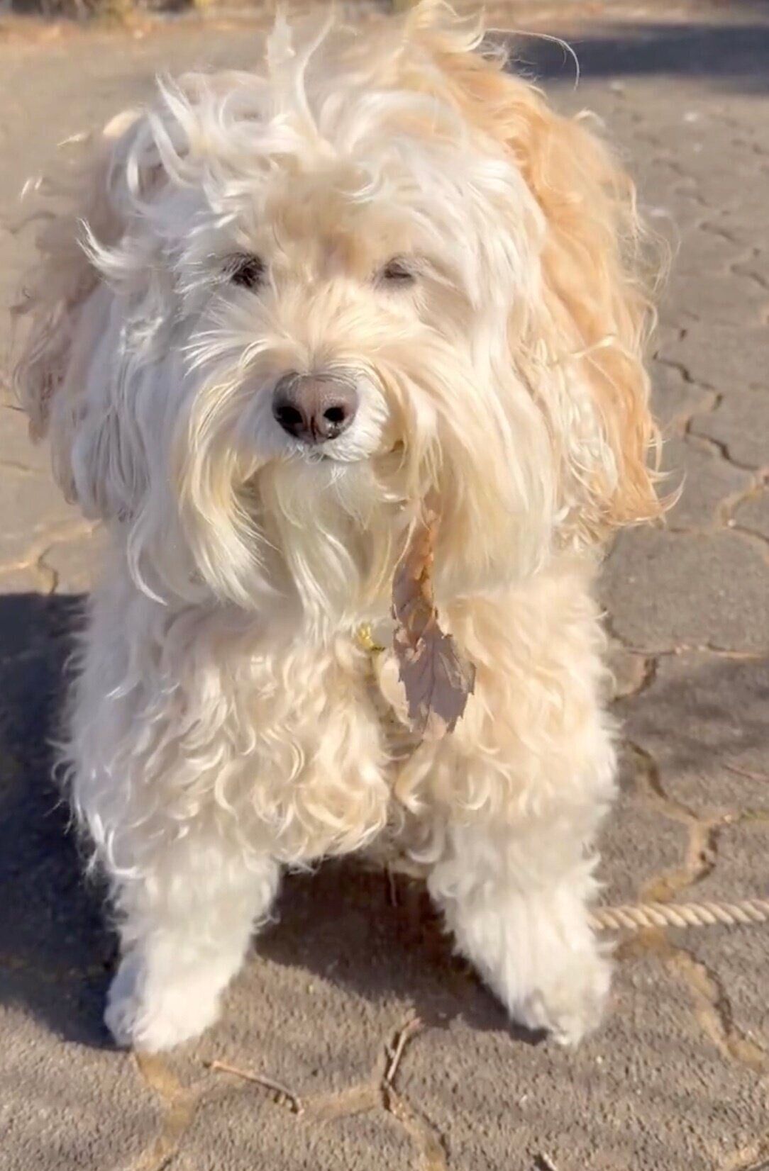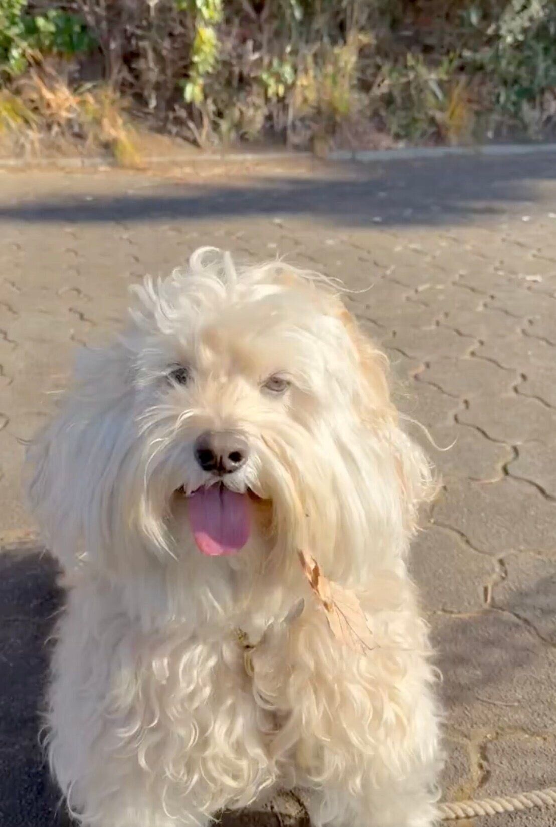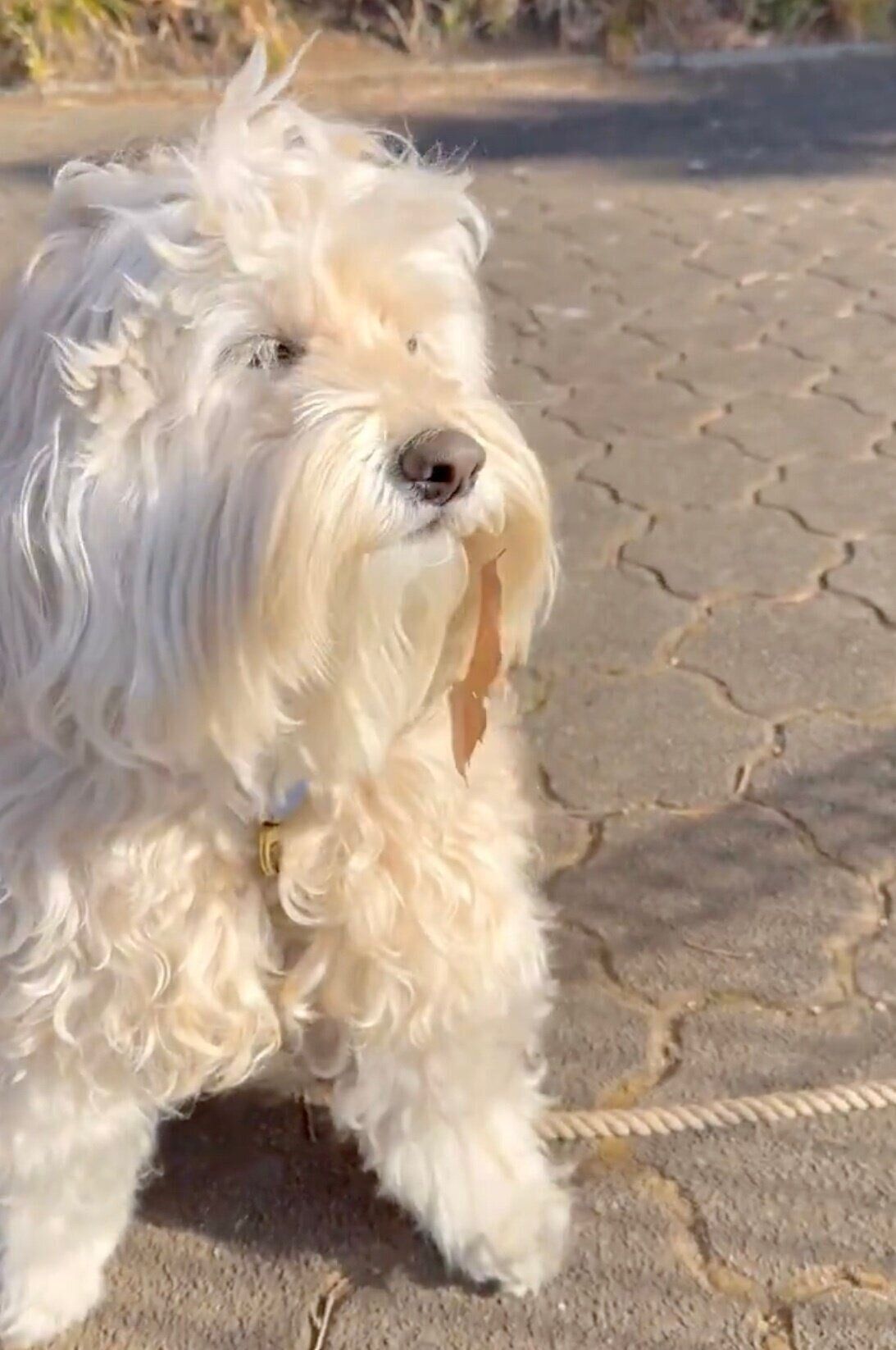 ウェーブがかったふわふわの毛並みが特徴のかまぼこくん。動画では落ち葉をぶら下げて、愛らしさ満点の姿を見せてくれています。