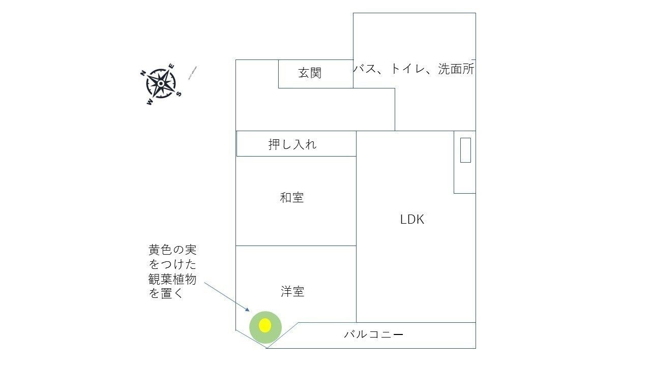 まずは、問題の西の出っ張りに置いた観葉植物に、100円グッズでいいから、レモンの小物を吊下げること。「西に黄色」の風水は、金運アップの鉄板だからね。