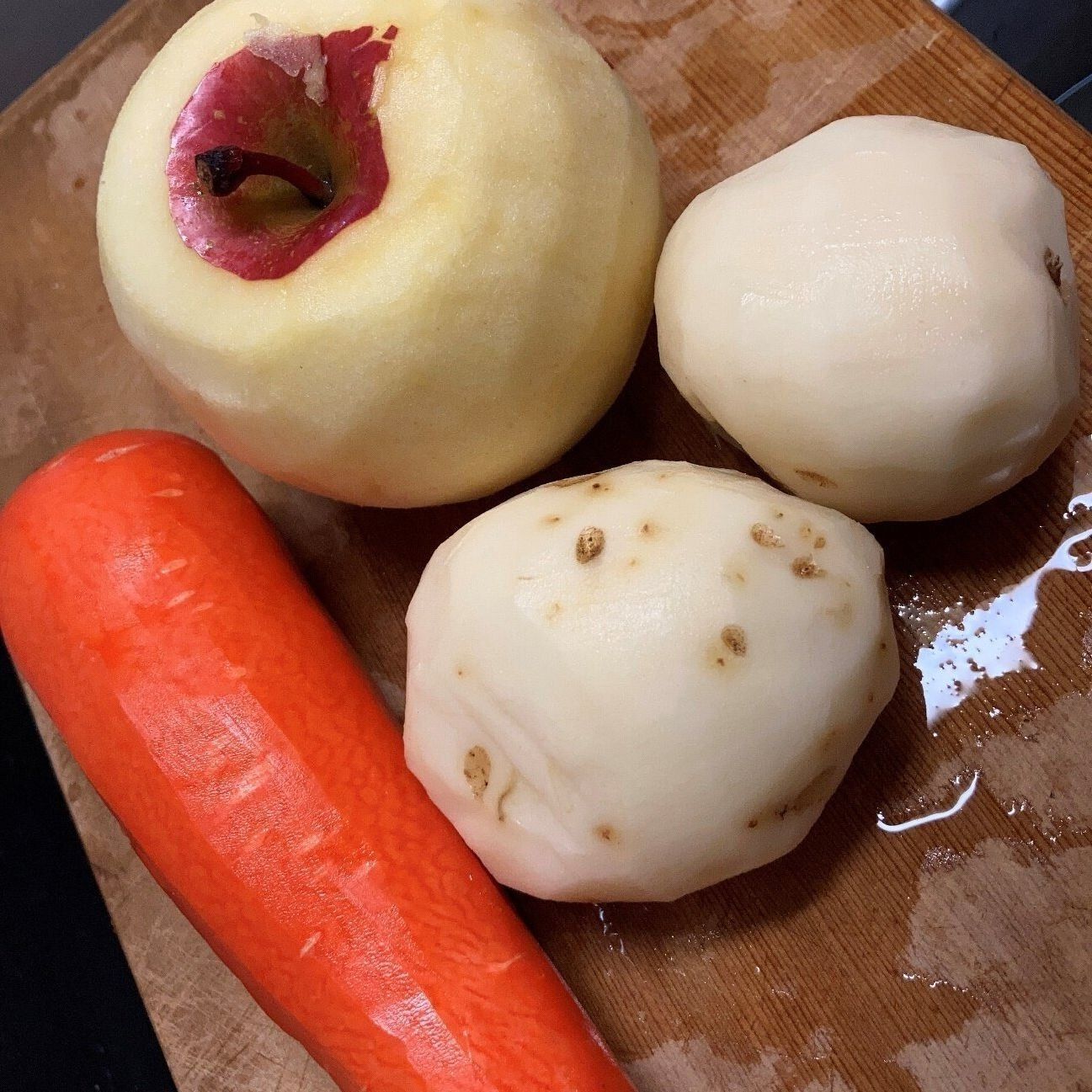りんご・じゃがいも・ニンジンの皮をむいてみたところ、とても薄くむけました。時間は全部で10分くらいしかかかっていない、なのにこの薄さってすごくないですか?