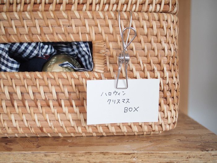 中身のわかりにくい季節もののボックスラベリングも、ひっかけるワイヤークリップを使ってこんなにおしゃれに実現することができます。ひっかけられる部分があれば、どんな場所でも使えるところが優秀。名刺サイズの紙を用意して、クリップに挟めばラベリング完了!