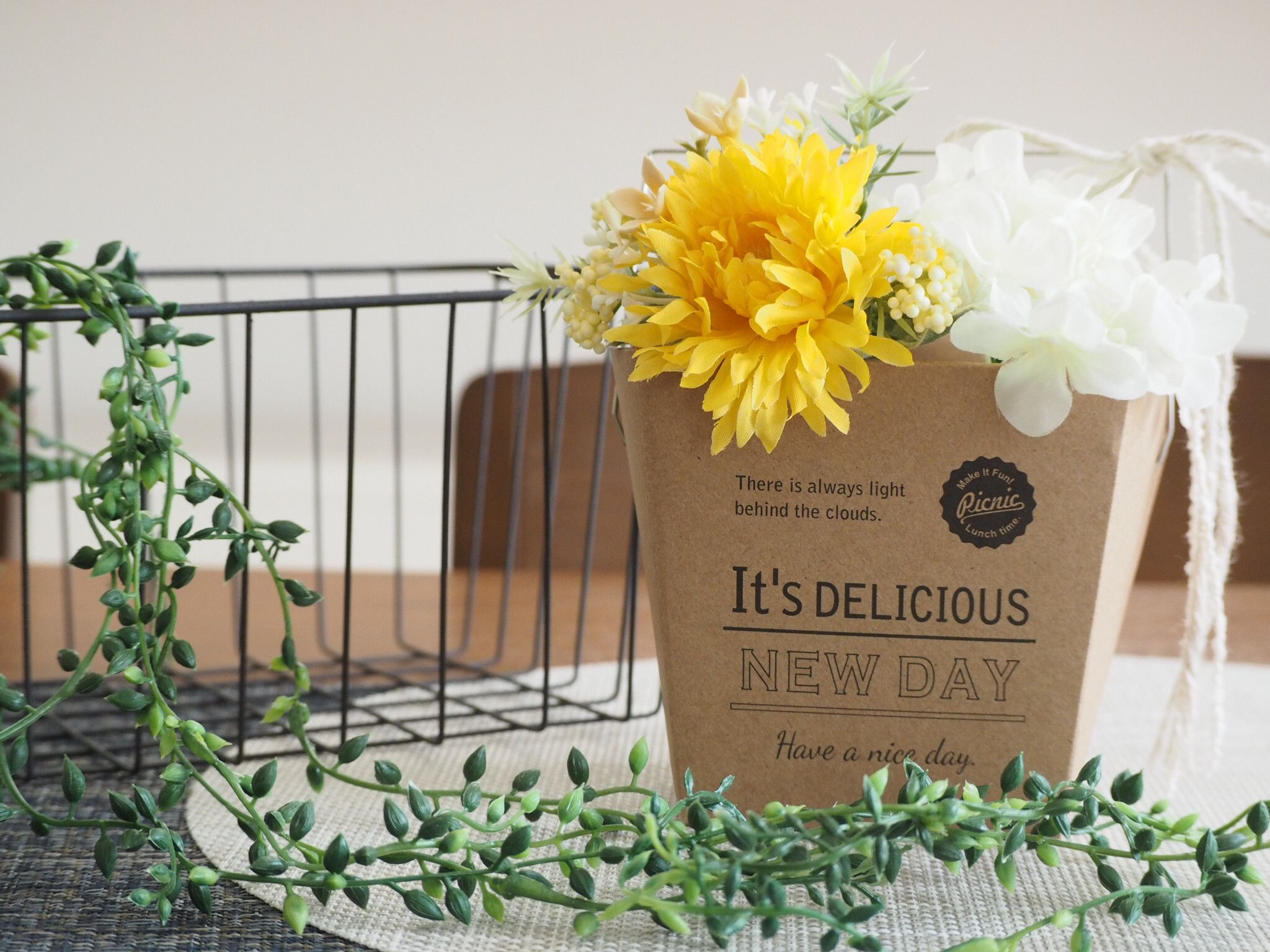 100円ショップにはクラフト紙でできているアイテムが沢山!お庭に咲いている花や造花でもクラフトでできているものを器にするといつもとはまた違った新鮮な気分でグリーンインテリアを楽しめます!