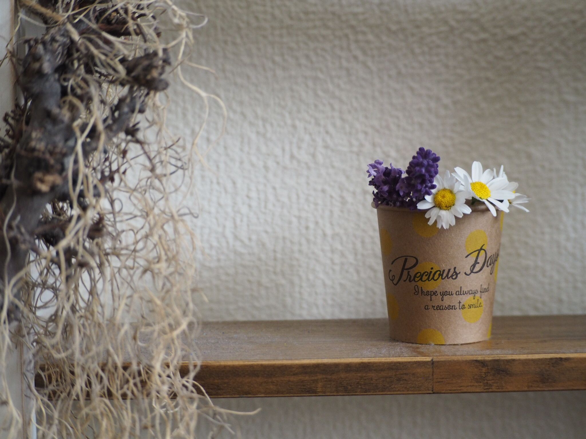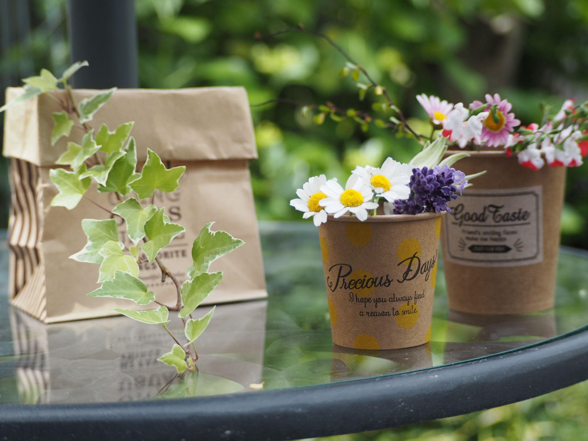クラフトでできた紙コップは今やどこでもお手軽に手に入るように。シンプルなものからデザイン性のあるもの、気分やお花に合わせて色々な器でグリーンインテリアを楽しむことができます。「クラフトペーパーカッププレシャスデイズ柄20個入」100円(税別)