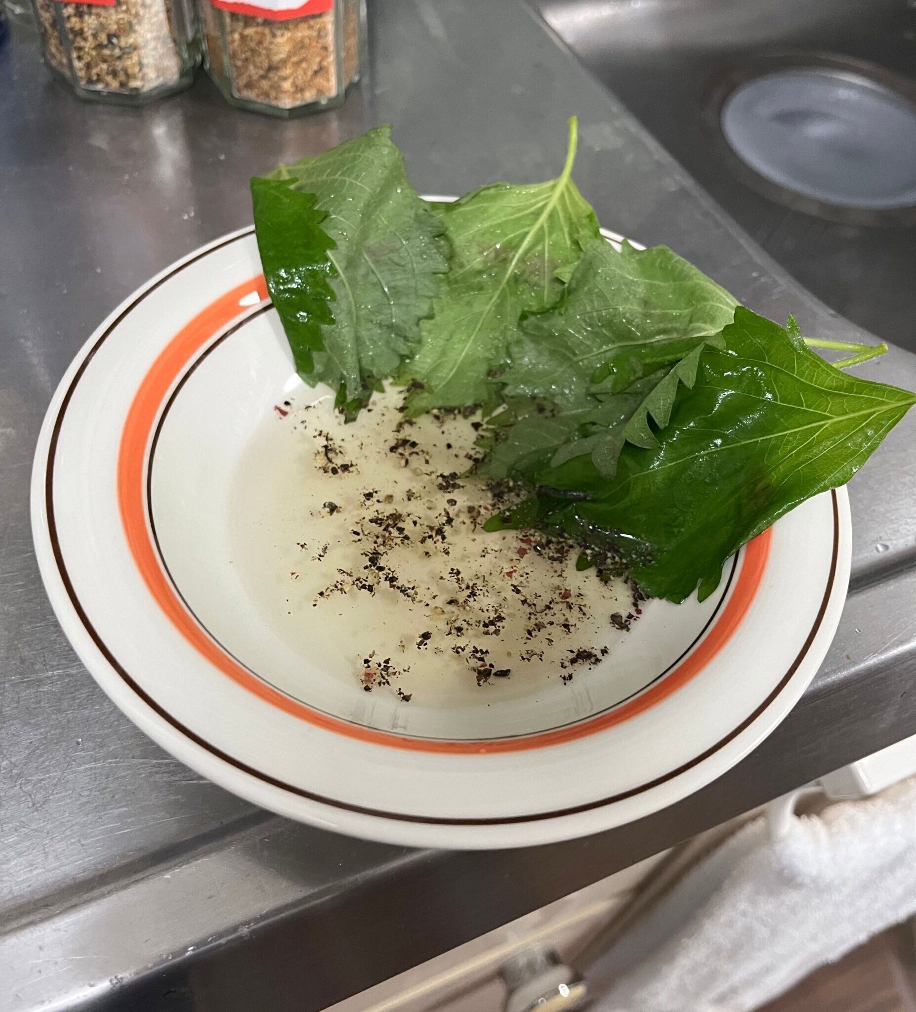 当時、餃子を食べるためのオリジナルのタレを考えていたという星眉さん。「酢コショウと大葉で食べたらおいしいはず」だと考え、それらを合わせてお皿にのせました。