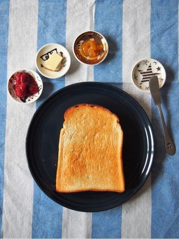 トーストだけの朝食。地味かな。。と思っちゃうところですが、豆皿にトーストのお供をちょこちょこ盛るだけでお洒落!