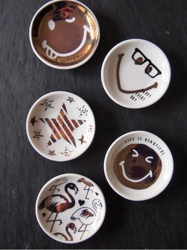食卓に出すだけで話題になりそうな、今までにない“セリア”の豆皿。トレンドのフラミンゴ柄やスターもキュート!ゴールドハッピーフェイスシリーズ ¥100(税別)