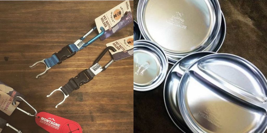 こちらはカラビナ付きのタオルホルダーとペットボトルホルダー。キャンプの時に、手を洗った後、すぐにタオルで手を拭ける!飲み物をホルダーに付ければ、小さいバッグだけで散策できる!というアイテム。重宝しそうです。