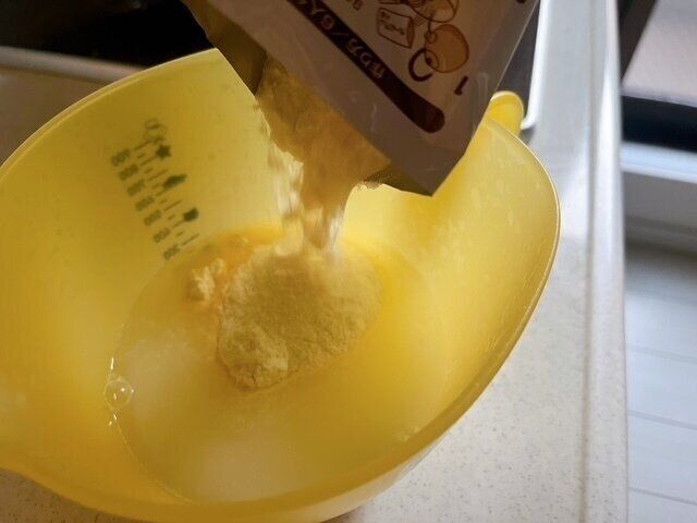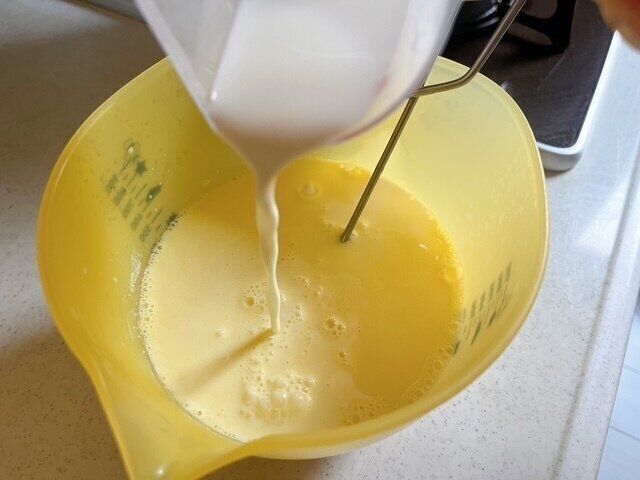 よく混ざったら牛乳150mlをいれます。ここでもよく混ぜます。このとき、牛乳ではなく豆乳でもOKです。