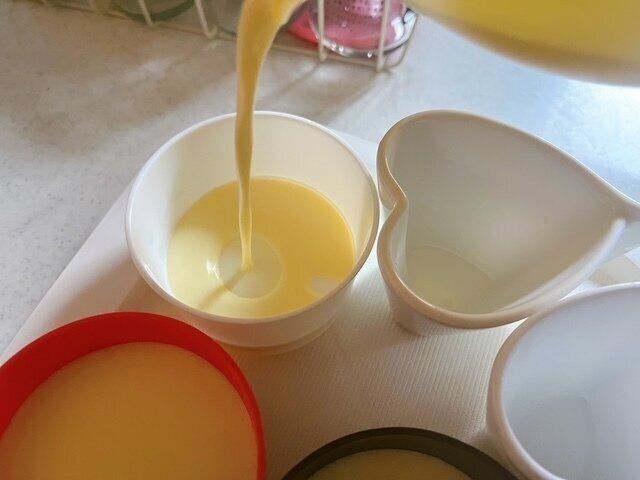粉っぽさがなくなってよく混ざったら好きな型に液を流し入れます。あとは冷やし固めるだけ。