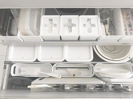 整理ボックスを4つ組み合わせて、来客時のカトラリーや割りばし、ピック、ストローなどを収納しています。細々した小物こそ小分けにするのが大切なのかもしれませんね。