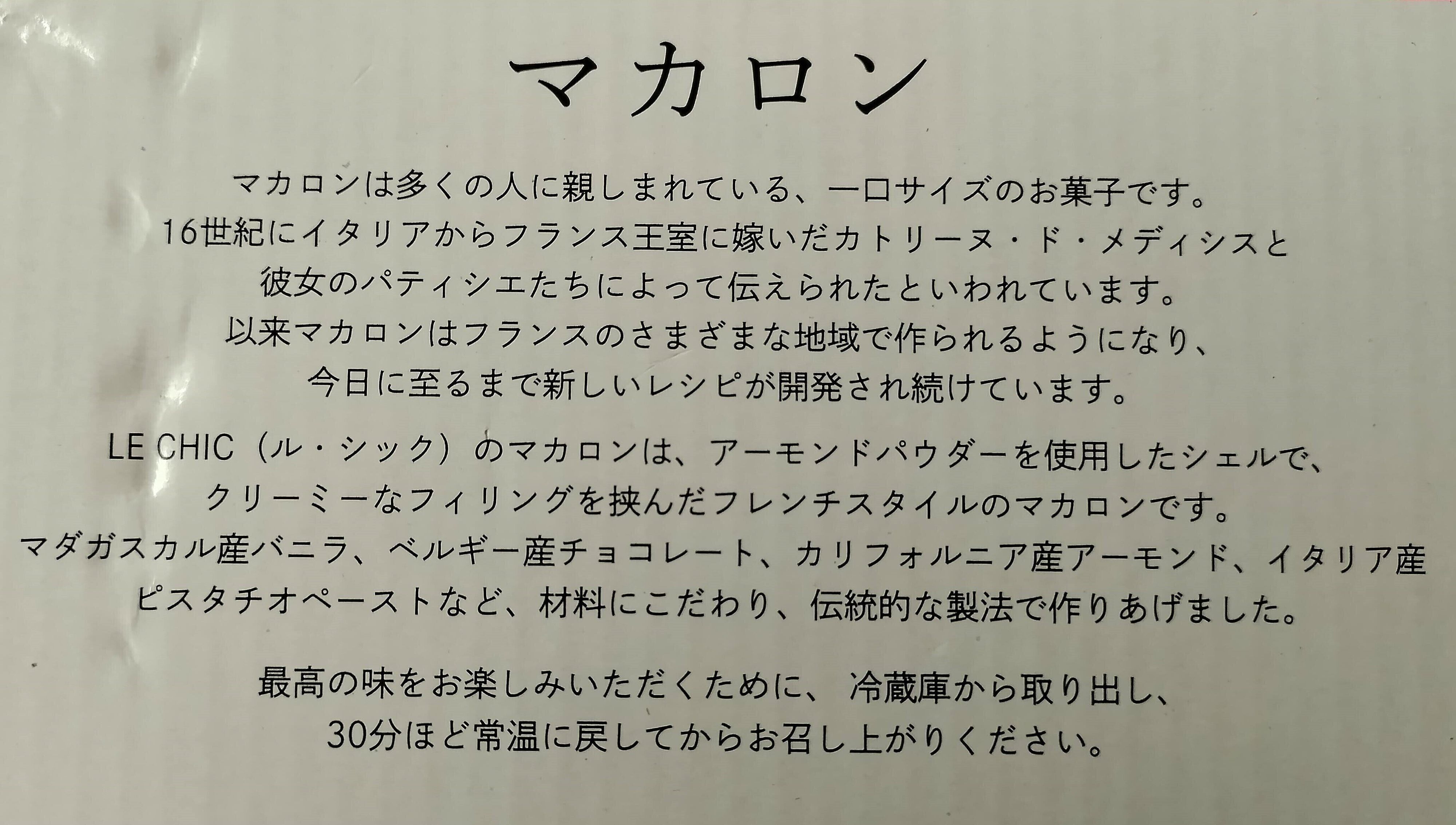 「LE CHIC マカロン」の原産国はベルギーですが、フレンチスタイルのマカロンとのこと。さっくりしたシェルが口の中でほろほろほどける食感で、まさにオーソドックスなマカロンといった印象です。