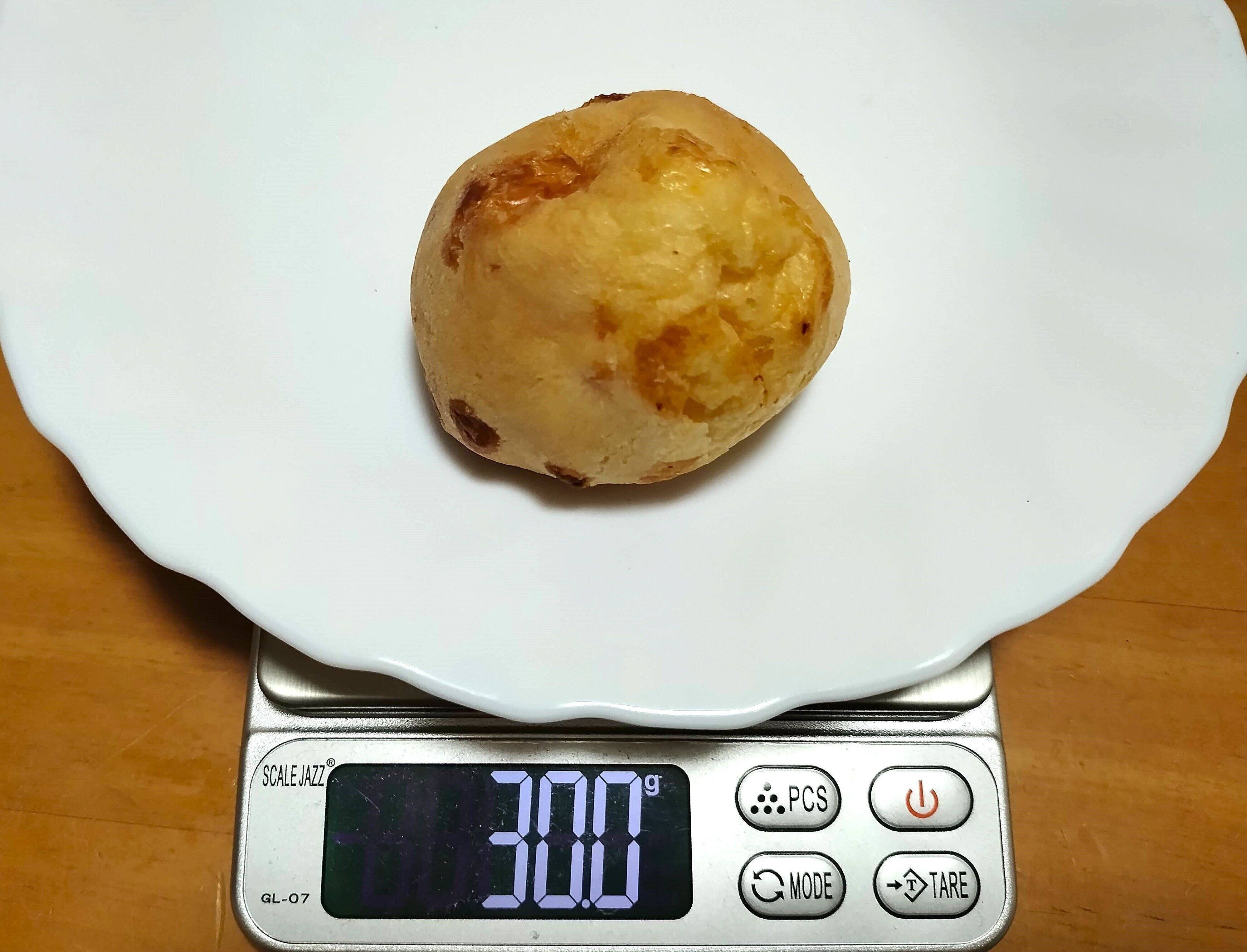 こちらがロピアの「ポンデケージョ」です。重さを測ってみたところ、筆者が購入した袋に入っていたポンデケージョは1つ30〜32gのものが多かったです。