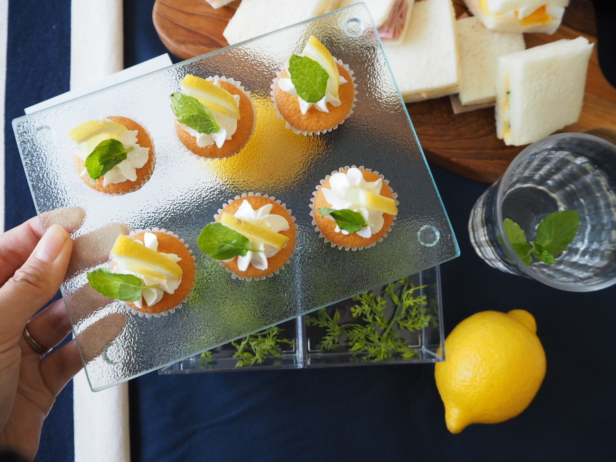 テーブルの上に少し高さを出したいときはキューブボックスの上にキッチンボードを重ねて。キューブボックスの中にグリーンや貝殻などを入れればキッチンボードから透けて爽やかな印象に。