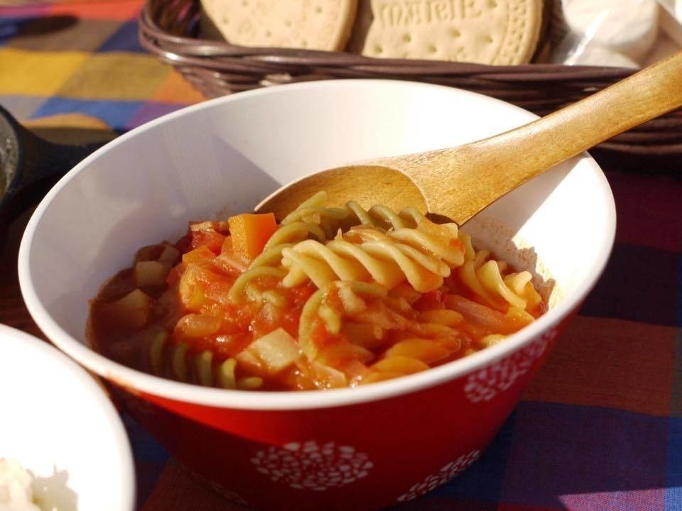 小さな子どもでも、おいしく野菜をたっぷり食べられる、簡単メニューです。パスタを入れずに水の量を調節してスープにしたり、煮詰めてごはんにかけたりしてもおいしい。子どもには、玉ねぎの皮をむいてもらったり、トマト缶、水、パスタを加えたりするところを手伝ってもらうなど、一緒に取り組めます。