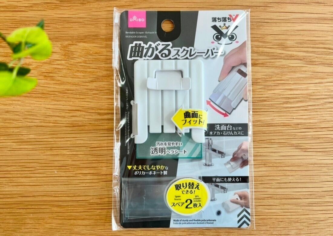ご紹介するのは、ダイソーの「曲がるワイドスクレーパー(落ち落ちV)」という商品。一般的なスクレーパーでは、曲面の汚れを落とすのが難しいというのが弱点です。ですが、こちらのスクレーパーは曲がる形状になっていて、平面でも曲面でもいろんな場所にフィットし、水垢や石鹸カスなどの汚れを落とすことができる画期的なスクレーパーなんですよ。価格は110円で販売されています。