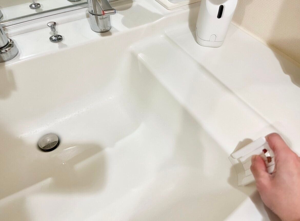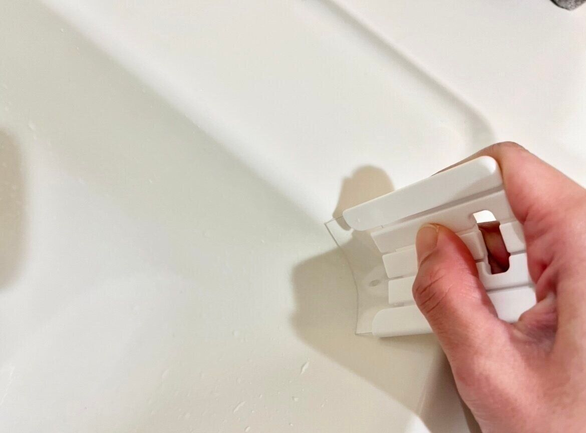 実際に洗面所のお掃除で使ってみました。洗面所の四隅って、緩やかなカーブがあるのでお掃除がしにくい場所ですよね?ですがこちらのスクレーパーはギュッと曲げることができるので、カーブに合わせてしっかりフィットさせながらお掃除することに成功!今まで諦めかけていたカーブの部分を手軽にお掃除することができました。