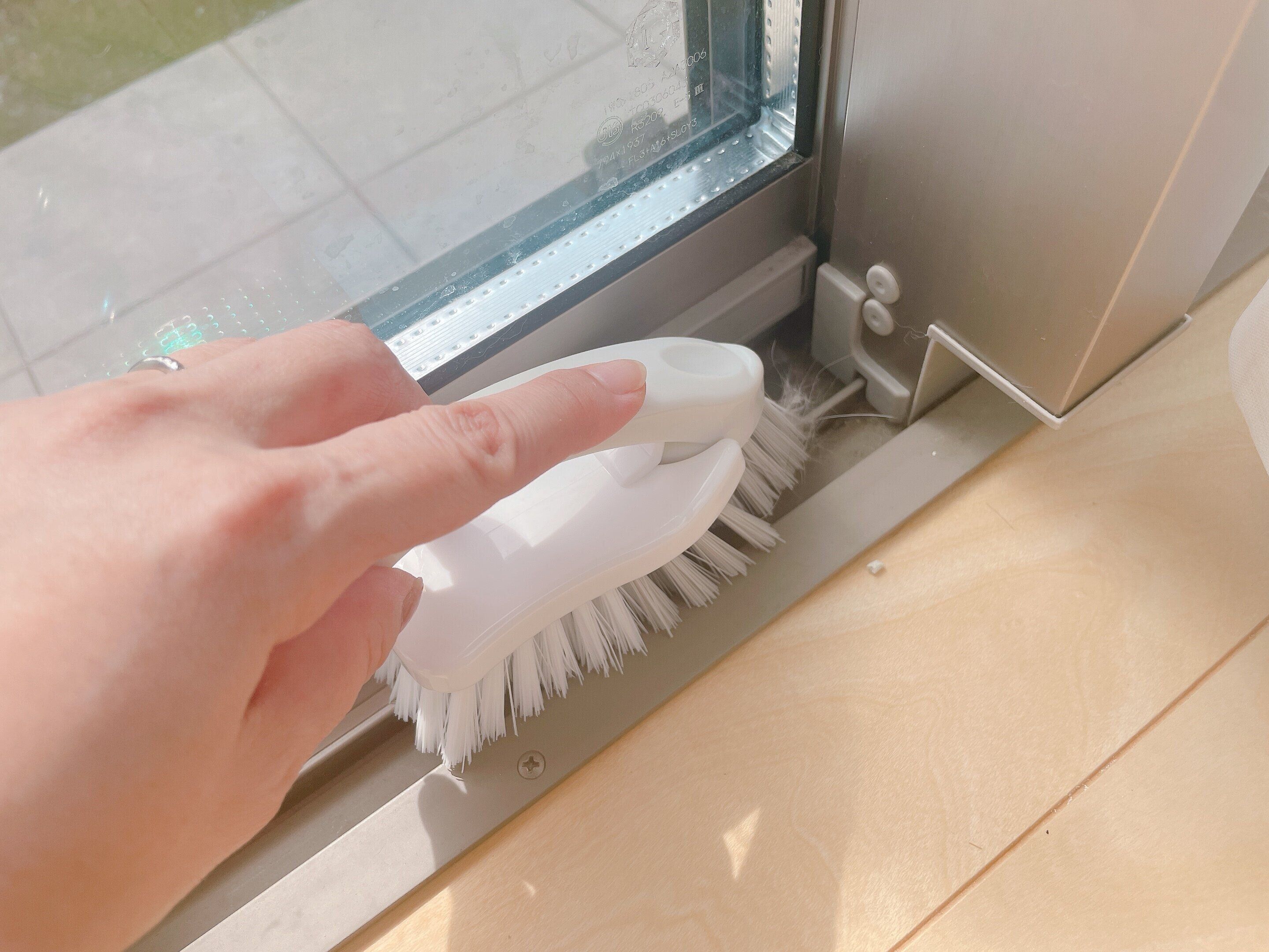 「3WAYタイルブラシ」のポイントは、ヘッド部分が取り外せることです。これのおかげで、狭い隙間や細かい部分の汚れも簡単に落とすことができます。特にサッシのレール部分や窓枠の角に入り込んだ花粉やホコリも、しっかりとかき出せるので、普段手が届かない部分の掃除がスムーズになります!
