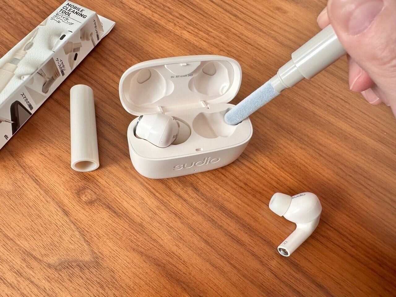 イヤホンの音が出る部分には、ピッカーを使ってホコリが取れるようになっていて、イヤホン周りのホコリを取るのには小さなブラシが大活躍!イヤホンだけでなく、スマホのちょっとした溝部分の汚れもキレイにかき出してくれるんです。ボアスティックは、イヤホンケースの充電器部分の奥のホコリまで、キレイに取り除くことができるようになっていますよ。