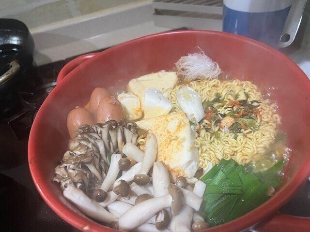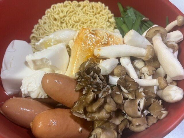 野菜はねぎ、にら、きのこ類。そして、ソーセージと豆腐、乾麺もいれました。