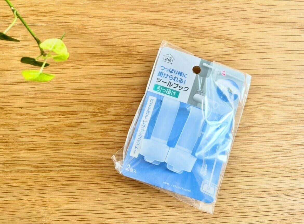 ご紹介するのは、セリアの「つっぱり棒に掛けられるツールフック」。こちらの商品は、2個入りで価格は110円で販売されています。
