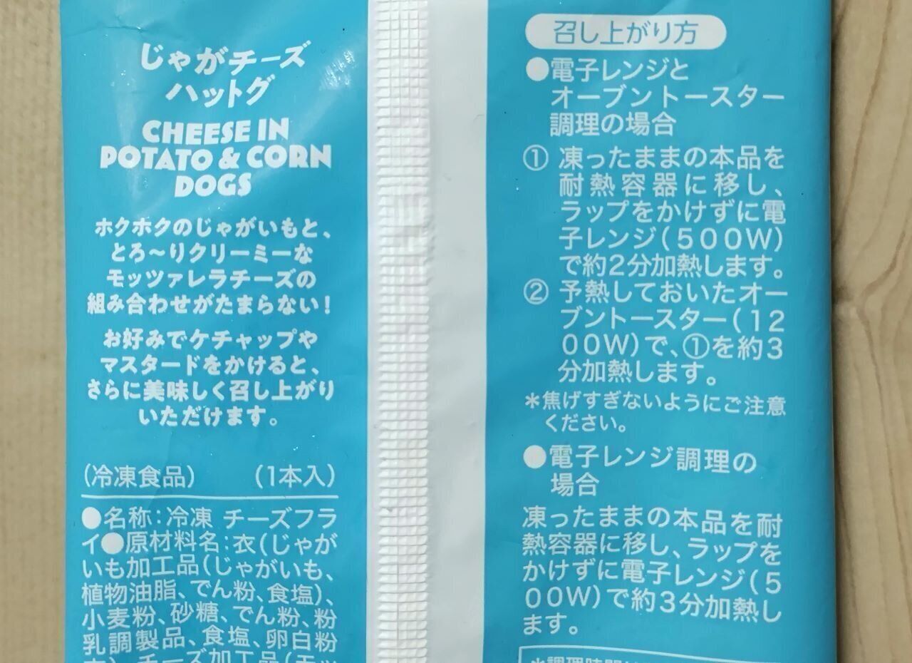 じゃがチーズハットグの調理方法には2とおりあります。まずは電子レンジとオーブントースターを使った調理の場合。凍ったままのじゃがチーズハットグを耐熱容器に移し、2分(500W)加熱します。そのあと、予熱しておいたオーブントースターで3分(1200W)焼きます。電子レンジ調理の場合は、凍ったままのじゃがチーズハットグで3分(500W)温めるだけ。